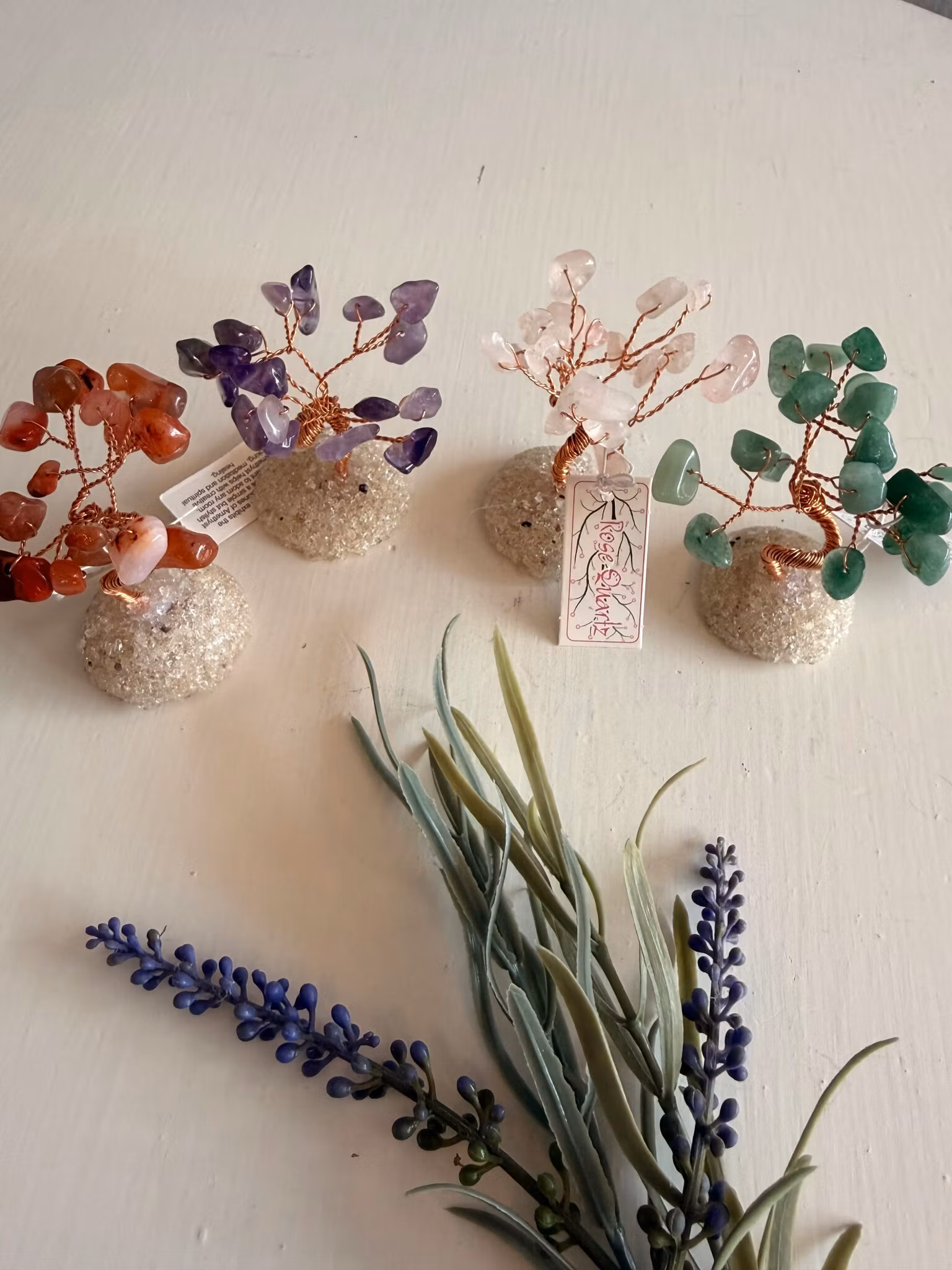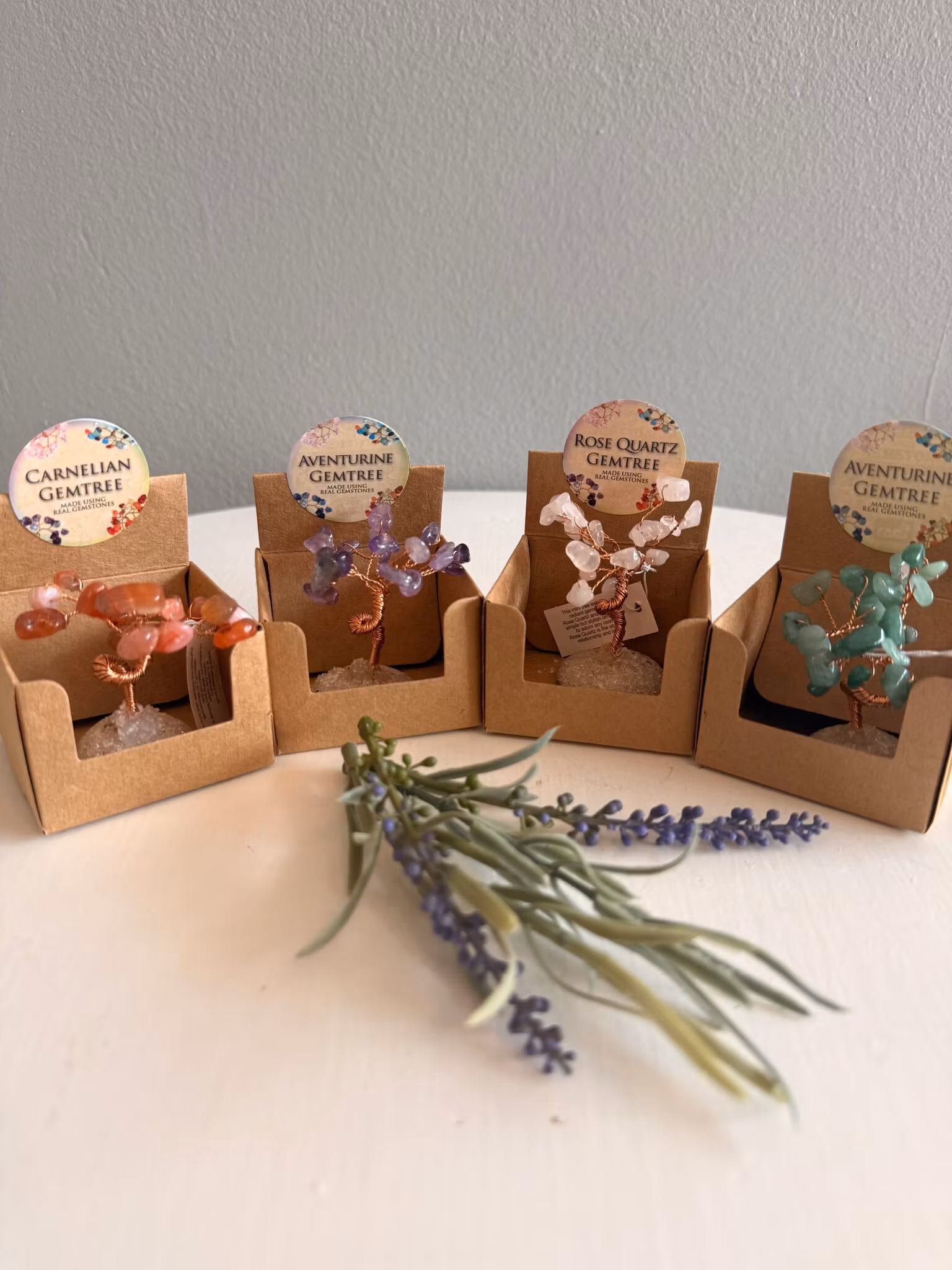 Edelstensträd är vackra dekorationsföremål skapade av äkta kristaller som formas till små träd. Varje träd är unikt och visar stenarnas naturliga färger och lyster på ett sätt som fångar ljuset och skapar en rogivande atmosfär i rummet. Dessa träd förknippas ofta med tillväxt, balans och livsenergi, och passar lika bra i hemmet som på arbetsplatsen. Perfekta som gåva eller som en personlig detalj i din egen inredning. Träden finns i olika stensorter som ametist, karneol och mixade varianter, och varje display innehåller en blandning där antalet av varje sort kan variera.