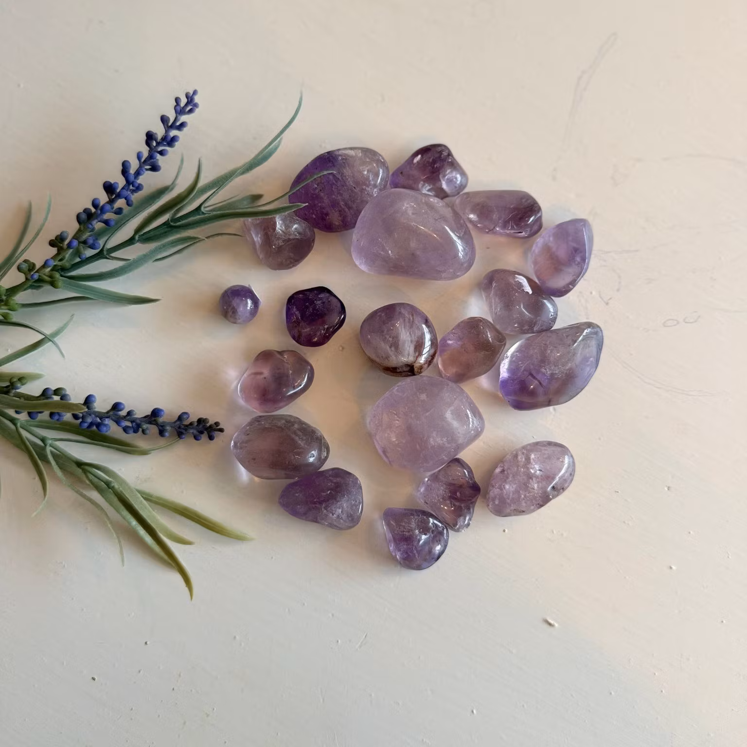 En mjukt polerad ametist som bär lugnets, klarhetens och intuitionens energi. Varje sten är unik i färg och mönster, från ljus lavendel till djup violett – allt
