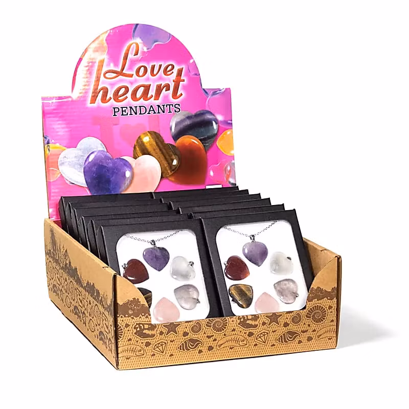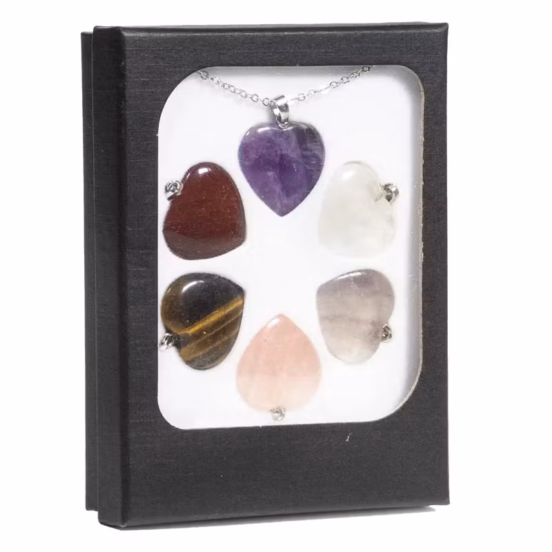 En elegant display med 12 set, vardera innehållande sex omsorgsfullt utvalda halvädelstenar formade som hjärtan, levererade i små presentaskar med kedja. En harmonisk kollektion där varje sten bär sin egen energi och sitt eget uttryck — från klarhet och intuition till värme, styrka och kärlek.